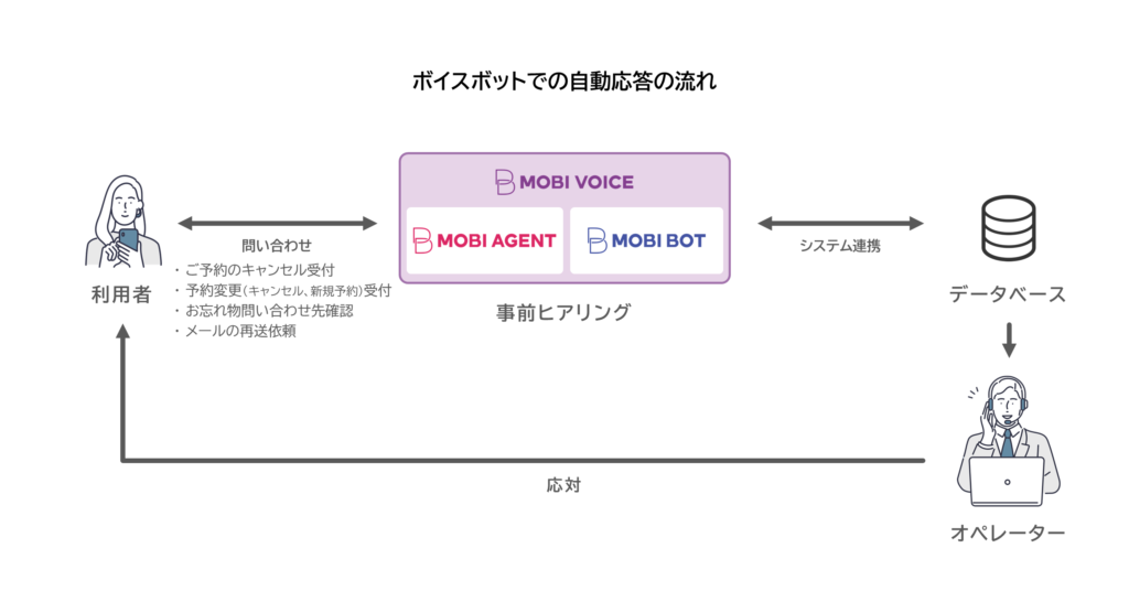 - 電話対応の効率化のために「MOBI VOICE」を導入し、電話での「キャンセル受付」「予約変更(キャンセル・ニューブック)受付」「遺失物の照会」「メールの再送」を自動応答化。