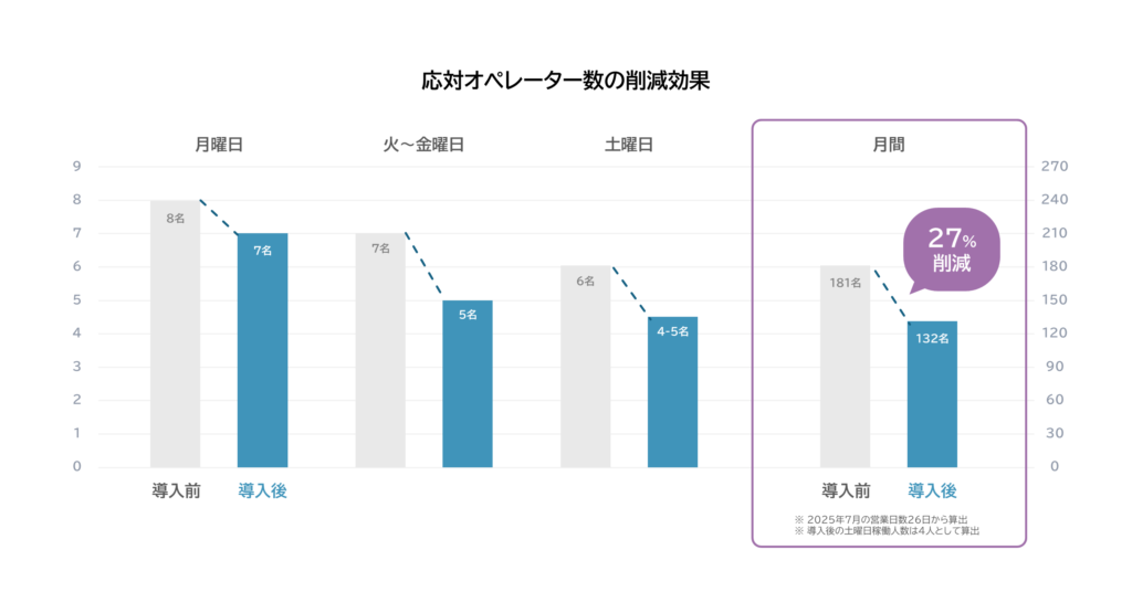 加えて、大幅な業務効率化にもつながりました。具体的には、コールセンターの対応人数を、月曜日は8名から7名(1名減)、火から金曜日は7名から5名(2名減)、土曜日は6名から4-5名(1-2名減)へと、それぞれ削減しました。月間稼働人数ベース※3で27%の削減となるので、これは大きな導入効果です。