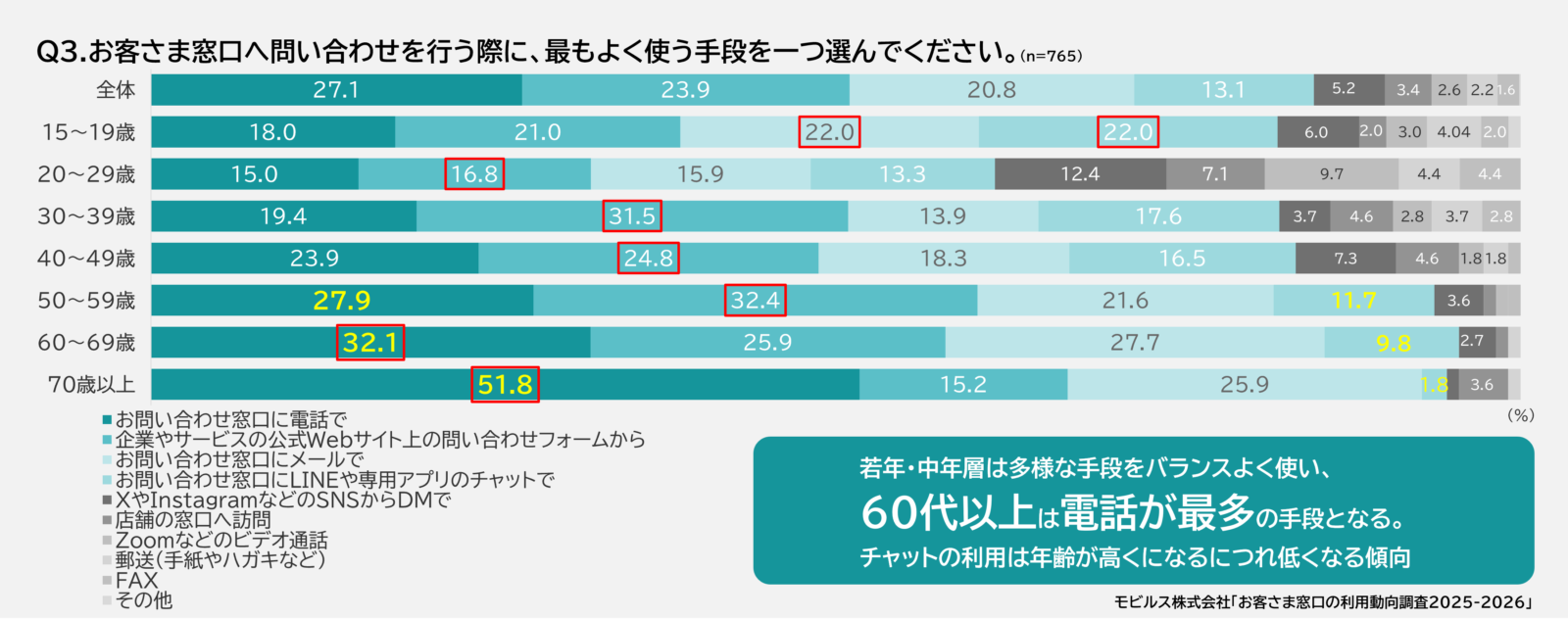 最もよく使う手段を年代別にみると、若年層・中年層は多様な問い合わせ手段を使い、60代以上は電話が最多でした。