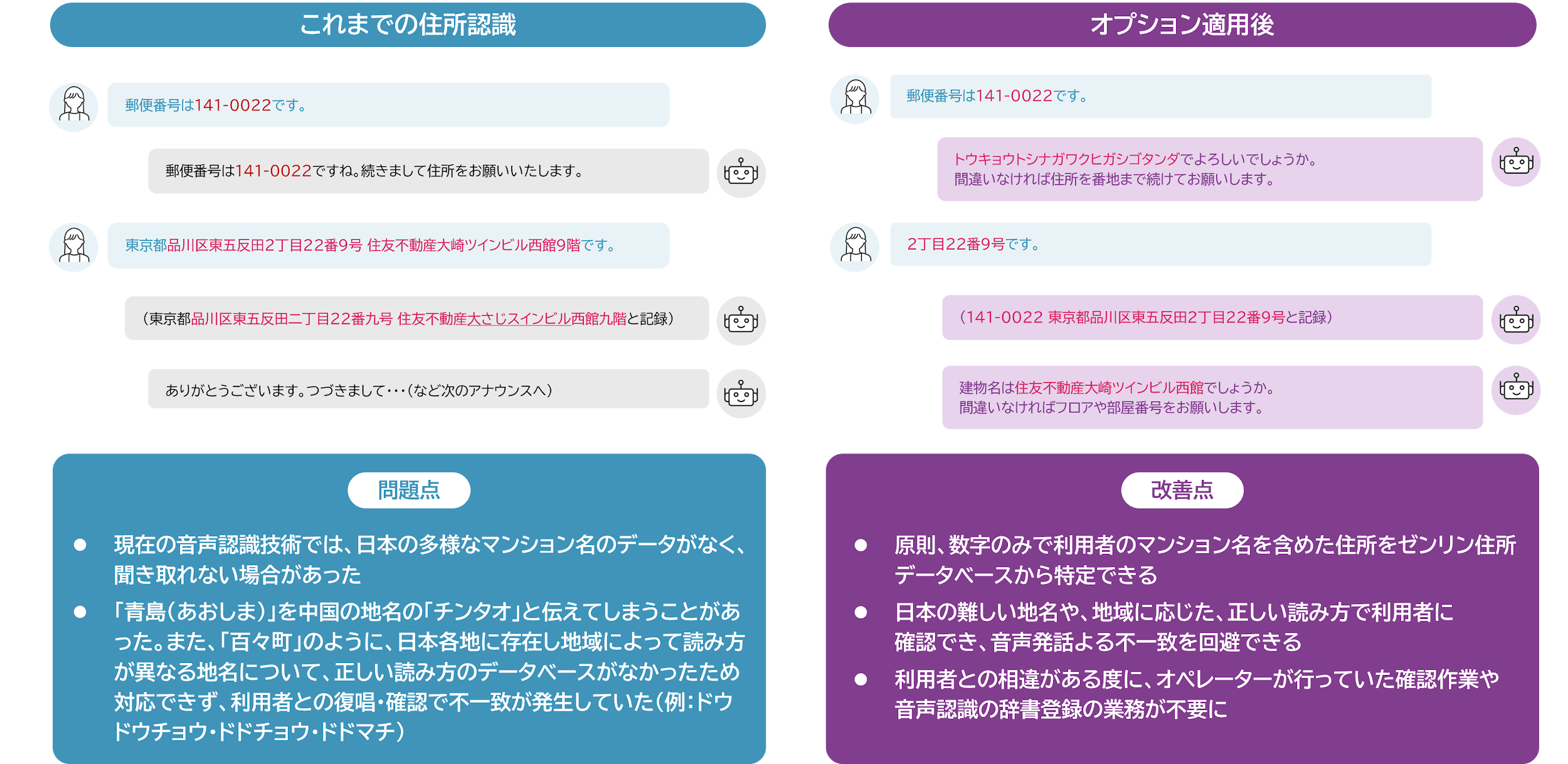 原則として、利用者との通話音声から得られた郵便番号や番地の数字情報のみで、マンション名を含む住所をゼンリン住所データベースから特定できます。また、日本の難読地名や地域特有の読み方にも対応し、利用者へ復唱・確認することで音声認識の不一致を防ぎ、ストレスなく円滑なコミュニケーションを可能にします。
