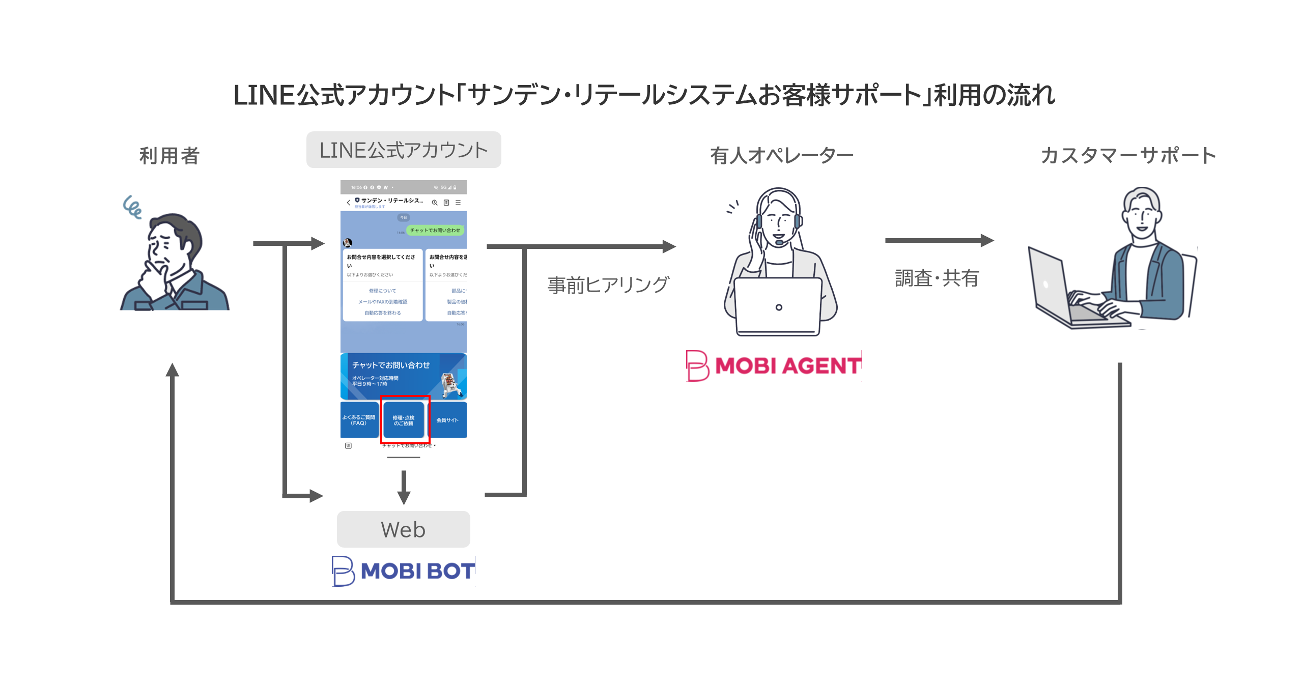 サンデン・リテールシステムは、「MOBI AGENT」と「MOBI BOT」を導入し、製品・サービスに関する修理や点検の問い合わせ受け付けを、自社Webサイトでは2025年1月から、LINE公式アカウント「サンデン・リテールシステムお客様サポート」では2025年4月から運用開始しています。また、従来の問い合わせ窓口であった電話対応を2025年3月に終了し、窓口業務をWebサイトおよびLINE公式アカウントへ完全移行させることで、業務効率化を実現しました。