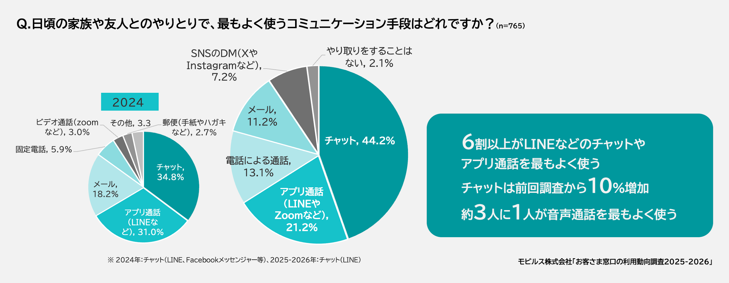 ・日常のコミュニケーション手段はチャットが最多(44.2%)で前回比9.4%増。電話(13.1%)とアプリ通話(21.2%)を合わせると34.3%と音声ニーズも一定数存在。