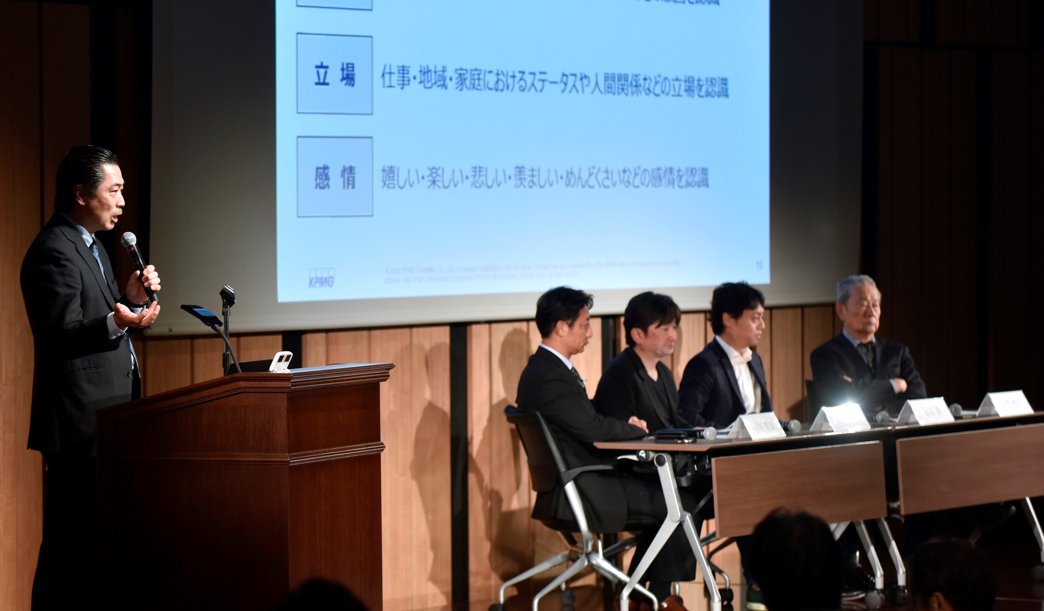 第1部の最後に出井 伸之、松尾 豊氏、榮藤 稔氏に加え、モビルス代表取締役 石井 智宏の4名でパネルディスカッションを行いました。モデレーターのKPMGコンサルティング株式会社 執行役員 パートナー 椎名 茂氏よりこれまでのAIの歴史と課題を振り返り、「AIは言葉の意味を理解しているのか?」「人と機械のインタフェースは今後どのようになるか?」「人間と機械の対話について、VRとARの可能性は?」「AIが人と対話する上で必要なものとは?」など、様々な視点でディスカッションが行われました。最後に「将来に向け、今何を準備すべきか?10年後はどのような世界になっているか?」との問いに、榮藤氏は「人間と機械のインタフェースは、Windows95やiPhoneの登場のように10年に1回の頻度でパラダイムシフトが起きています。あと2、3年経てば、素晴らしいインタフェースができ、お年寄りがもっと楽になるとか、障がいを持つ方々がもっと普通に生きていけるようなインタフェースがAIの技術によってできると信じています」、松尾氏は「今のディープラーニングは20年前のインターネットと同じ状況にあると思います。技術的な根幹はできたが、それがいいビジネスモデルと繋がっていません。しかし、これから10年、20年でどんどんいい技術が出て、新しいビジネスモデルも生まれると思います。今は、いい技術が生まれる前夜だと思います」、石井は「人間とAIの会話が実現するのはそう遠くないと思いますし、自然に対話している世界も近いでしょう。対話型AIができると、身内や尊敬する人などをボット化して、故人になってもいつでも相談できるとか、そういう世界が実現すると思います。そのためにも、今はデータを貯めることが大事だと思います」とそれぞれの意見を述べました。最後に出井は「今、AIは大変換の最中にいると思います。今の日本の大学は理系と文系の区別をしていますが、日本のAI技術の発展のためにもそれはやめた方がいい。考え方を学ぶことの方が重要だと思います。子ども達が数学、楽譜、英語、プログラミングを中心に勉強すれば、日本の技術は変わると思います。AIをはじめ日本の技術の発展には、今の教育そのものを見直す必要があると思います」と語ってディスカッションを締めくくりました。